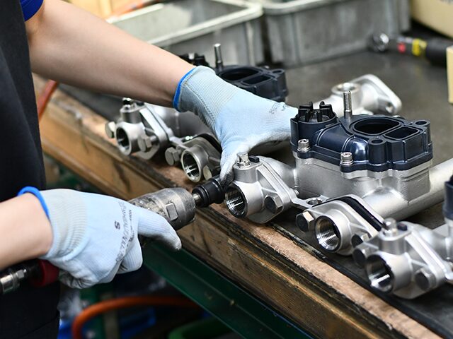 当社は、水道用ポンプの製造に特化した専門企業として「アッセンブリ(組立)」「塗装」「物流」の3部門を自社で一貫して運営しています。海外から輸入された部品を、社内で厳しく検品・管理し熟練の技術者が一つひとつ丁寧に組み立て、仕上げの塗装、そしてお客様の元へと納品。